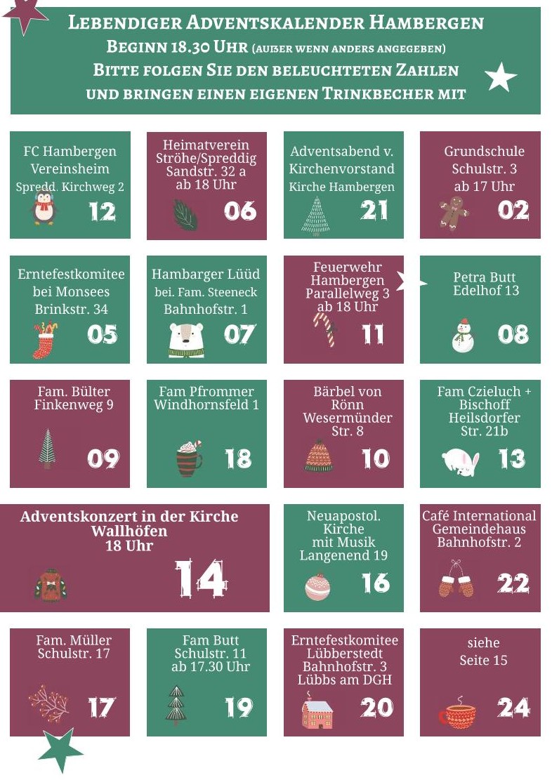 Es ist so schön: Zum 17. lebendigen Adventskalender haben sich wieder zahlreiche Gasgeberinnen und Gastgeber an unterschiedlichen Orten gefunden. Wir freuen uns über die gute Beteilugung und auf schöne Begegnungen im Advent. Alle Infos auf dem Bild.