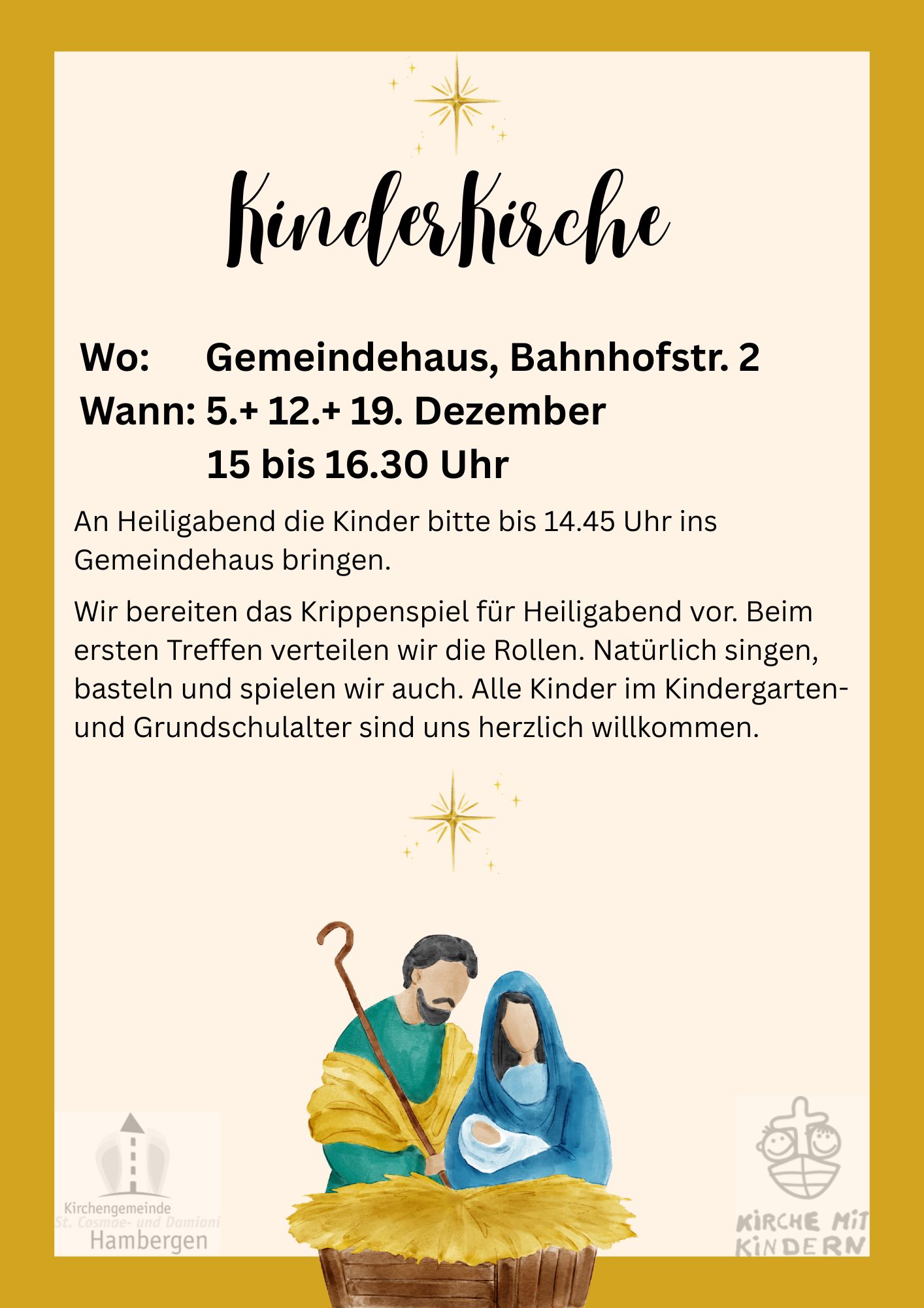 Im Dezember laden wir herzlich zur Kinderkirche ein. Wir werden für das Krippenspiel an Heiligabend proben, aber auch basteln, singen und spielen. Wir freuen uns auf alle Kinder im Kindergarten- und Grundschulalter.